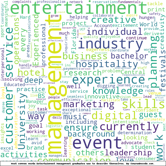 Here is a visual representation of the most common words seen in the "about" section of LinkedIn profiles who have a Bachelor degree in Entertainment Management (this is across all Entertainment Management graduates we've analyzed, not just those who went to Missouri State University). This may or may not be useful: