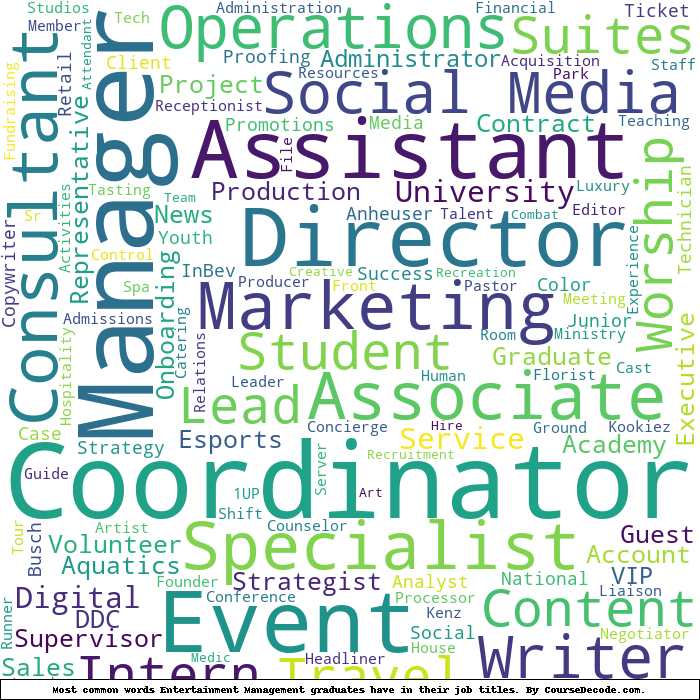 Here is a visual representation of the most common words in job titles for Entertainment Management graduates (this is across all Entertainment Management graduates we've analyzed, not just those who went to Missouri State University):