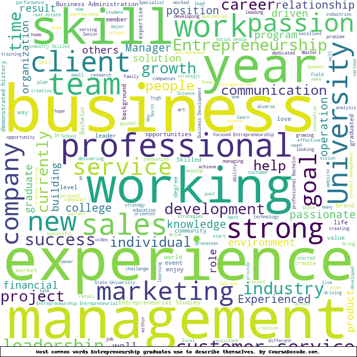Here is a visual representation of the most common words seen in the "about" section of LinkedIn profiles who have a Bachelor degree in Entrepreneurship. This may or may not be useful: