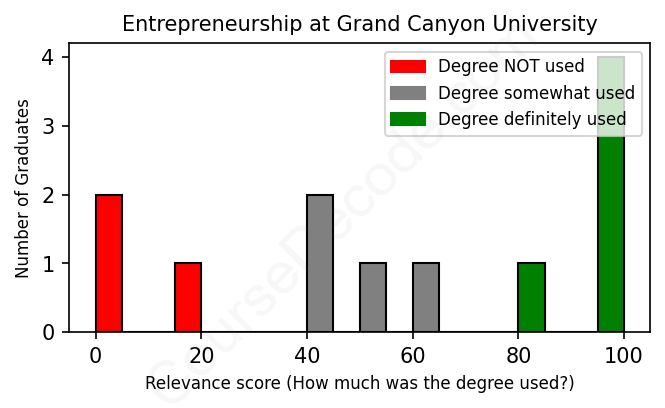 The verdict? Below average. Overall, with an average relevance score of 57%, Entrepreneurship graduates from Grand Canyon University have a lower likelihood (-10%) of finding work in this field compared to the average graduate across all fields: