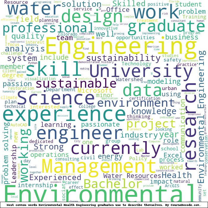 Here is a visual representation of the most common words seen in the "about" section of LinkedIn profiles who have a Bachelor degree in Environmental Health Engineering. This may or may not be useful: