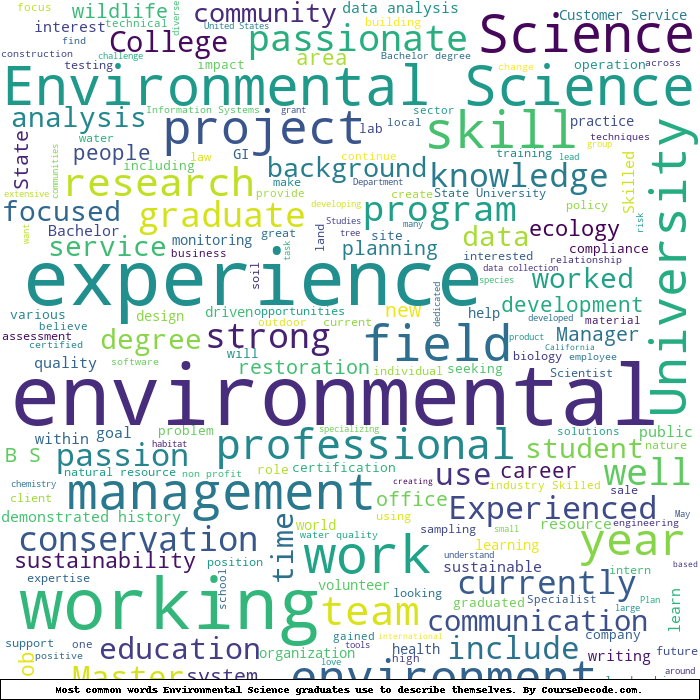 Here is a visual representation of the most common words seen in the "about" section of LinkedIn profiles who have a Bachelor degree in Environmental Science. This may or may not be useful: