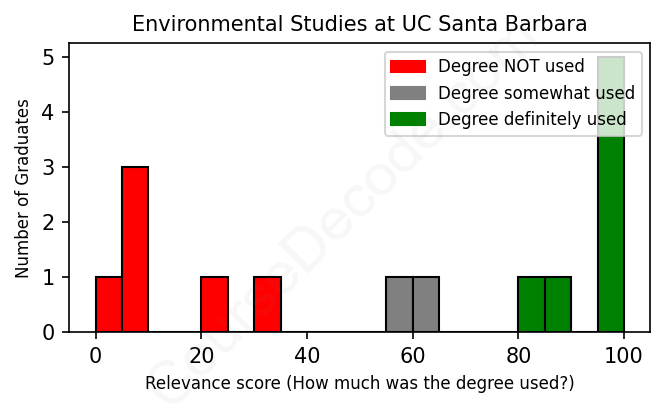 The verdict? Below average. Overall, with an average relevance score of 57%, Environmental Studies graduates from UC Santa Barbara have a lower likelihood (-10%) of finding work in this field compared to the average graduate across all fields: