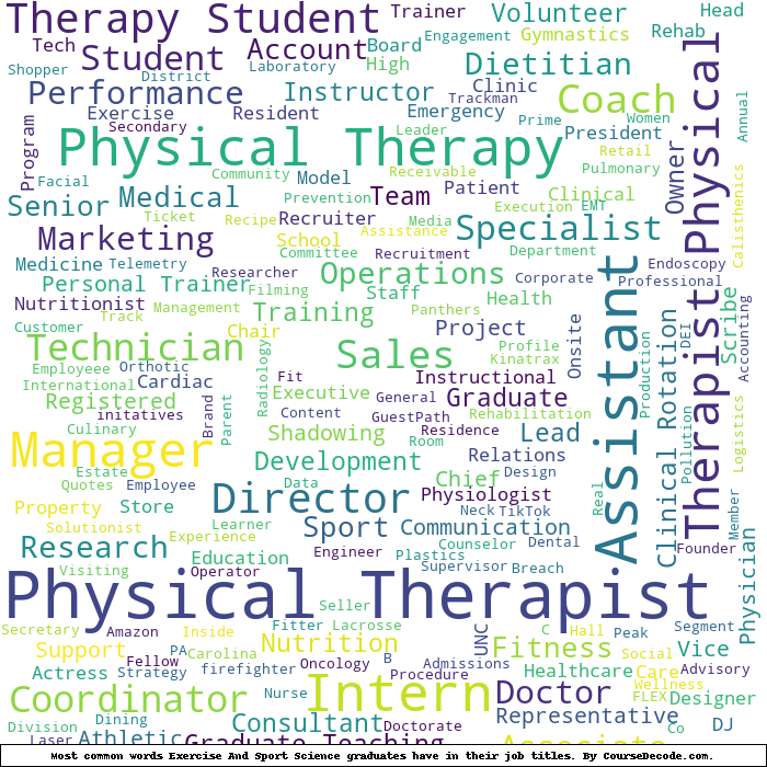 Here is a visual representation of the most common words in job titles for Exercise And Sport Science graduates (this is across all Exercise And Sport Science graduates we've analyzed, not just those who went to University of North Carolina at Chapel Hill):