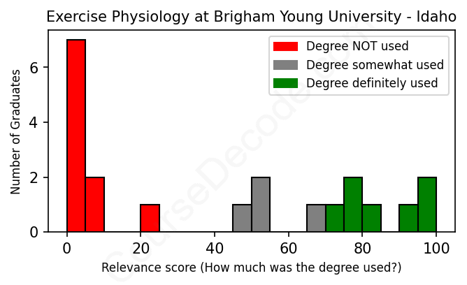 The verdict? Bad. Overall, with an average relevance score of 40%, Exercise Physiology graduates from Brigham Young University - Idaho have a substantially lower likelihood (-27%) of finding work in this field compared to the average graduate across all fields: