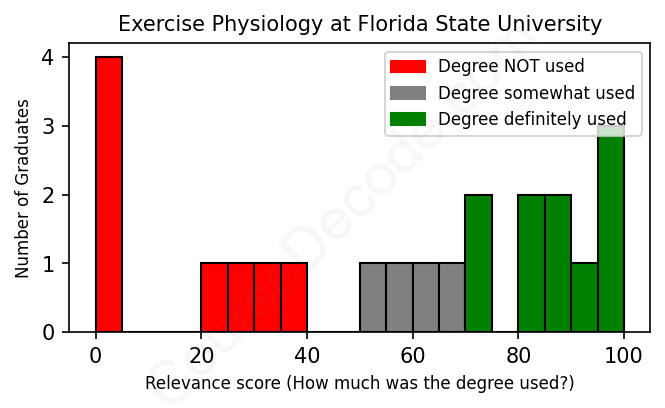 The verdict? Significantly below average. Overall, with an average relevance score of 55%, Exercise Physiology graduates from Florida State University have a much lower likelihood (-12%) of finding work in this field compared to the average graduate across all fields: