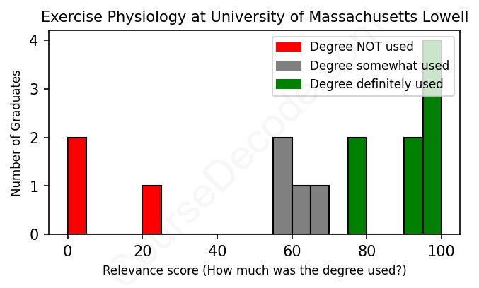 The verdict? Slightly below average. Overall, with an average relevance score of 66%, Exercise Physiology graduates from University of Massachusetts Lowell have a slightly lower likelihood (-1%) of finding work in this field compared to the average graduate across all fields: