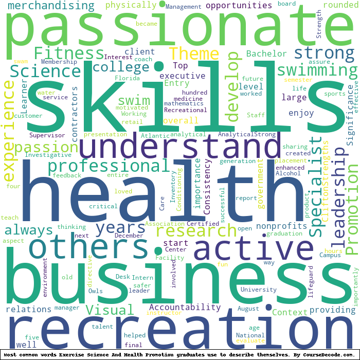 Here is a visual representation of the most common words seen in the "about" section of LinkedIn profiles who have a Bachelor degree in Exercise Science And Health Promotion (this is across all Exercise Science And Health Promotion graduates we've analyzed, not just those who went to Florida Atlantic University). This may or may not be useful: