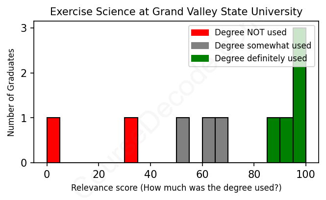The verdict? Slightly above average. Overall, with an average relevance score of 68%, Exercise Science graduates from Grand Valley State University have a slightly higher likelihood (+1%) of finding work in this field compared to the average graduate across all fields: