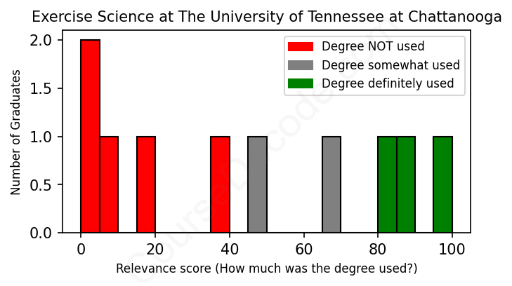 The verdict? Bad. Overall, with an average relevance score of 44%, Exercise Science graduates from The University of Tennessee at Chattanooga have a substantially lower likelihood (-23%) of finding work in this field compared to the average graduate across all fields: