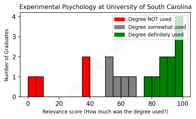 The verdict? Slightly below average. Overall, with an average relevance score of 66%, Experimental Psychology graduates from University of South Carolina have a slightly lower likelihood (-1%) of finding work in this field compared to the average graduate across all fields: