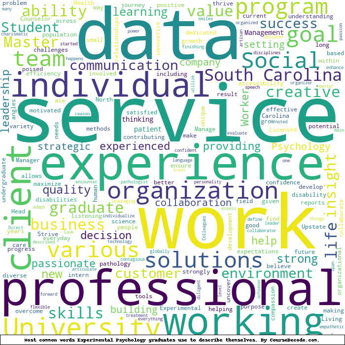 Here is a visual representation of the most common words seen in the "about" section of LinkedIn profiles who have a Bachelor degree in Experimental Psychology (this is across all Experimental Psychology graduates we've analyzed, not just those who went to University of South Carolina). This may or may not be useful: