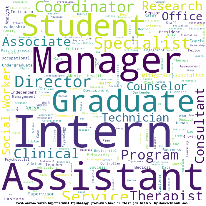 Here is a visual representation of the most common words in job titles for Experimental Psychology graduates (this is across all Experimental Psychology graduates we've analyzed, not just those who went to University of South Carolina):
