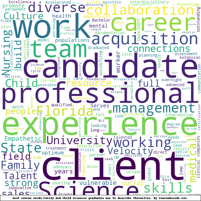 Here is a visual representation of the most common words seen in the "about" section of LinkedIn profiles who have a Bachelor degree in Family And Child Sciences (this is across all Family And Child Sciences graduates we've analyzed, not just those who went to Florida State University). This may or may not be useful: