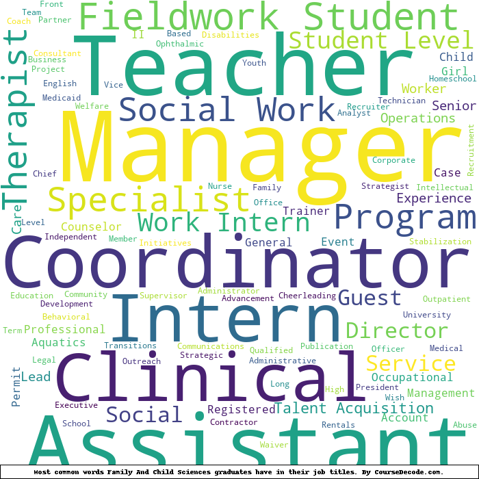 Here is a visual representation of the most common words in job titles for Family And Child Sciences graduates (this is across all Family And Child Sciences graduates we've analyzed, not just those who went to Florida State University):