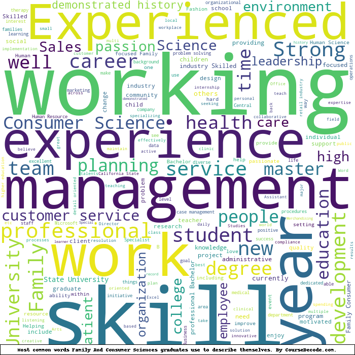 Here is a visual representation of the most common words seen in the "about" section of LinkedIn profiles who have a Bachelor degree in Family And Consumer Sciences. This may or may not be useful: