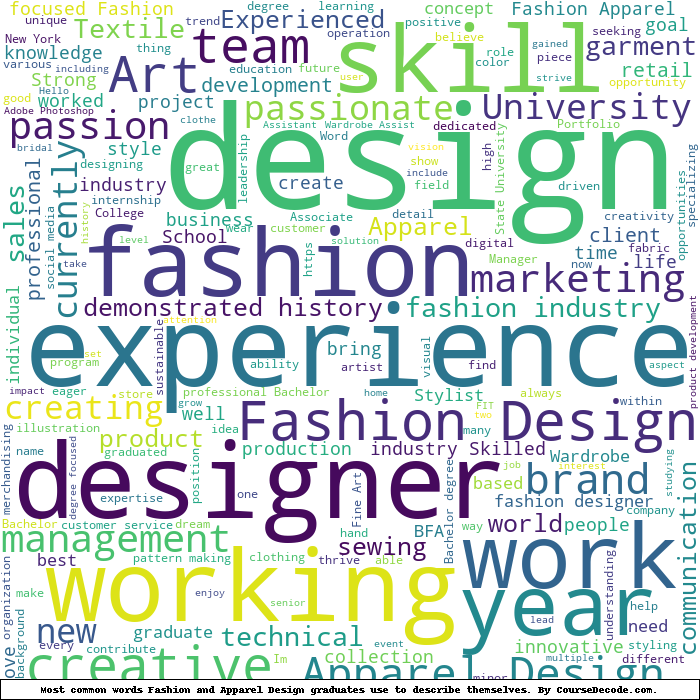 Here is a visual representation of the most common words seen in the "about" section of LinkedIn profiles who have a Bachelor degree in Fashion and Apparel Design. This may or may not be useful: