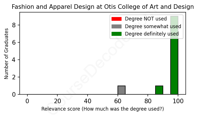 The verdict? Great! Overall, with an average relevance score of 95%, Fashion and Apparel Design graduates from Otis College of Art and Design have a substantially higher likelihood (+28%) of finding work in this field compared to the average graduate across all fields: