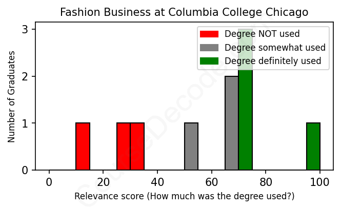 The verdict? Below average. Overall, with an average relevance score of 57%, Fashion Business graduates from Columbia College Chicago have a lower likelihood (-10%) of finding work in this field compared to the average graduate across all fields: