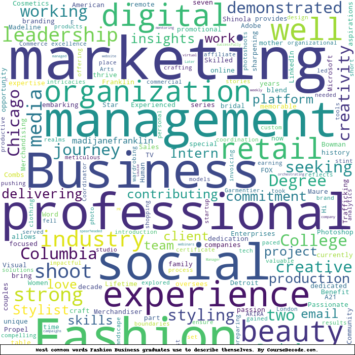 Here is a visual representation of the most common words seen in the "about" section of LinkedIn profiles who have a Bachelor degree in Fashion Business (this is across all Fashion Business graduates we've analyzed, not just those who went to Columbia College Chicago). This may or may not be useful: