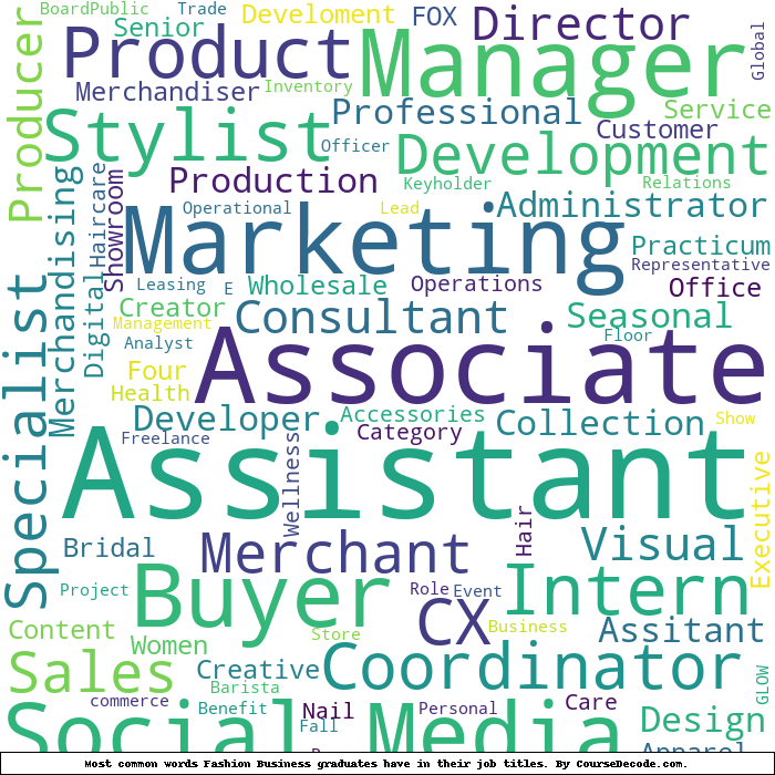 Here is a visual representation of the most common words in job titles for Fashion Business graduates (this is across all Fashion Business graduates we've analyzed, not just those who went to Columbia College Chicago):