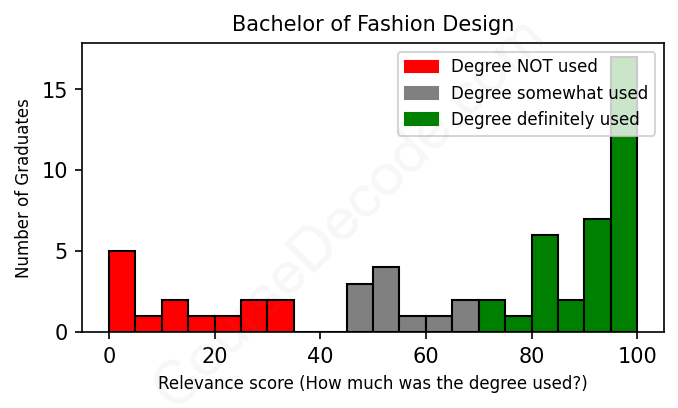 The verdict? Slightly below average. Overall, with an average relevance score of 66%, Fashion Design graduates have a slightly lower likelihood (-1%) of finding work in this field compared to the average graduate across all fields: