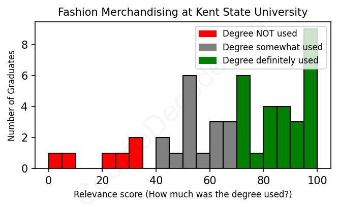 First, some facts. Of the Fashion Merchandising graduates from Kent State University we've analyzed , here's how many have used (or NOT used) their degree in their career:
