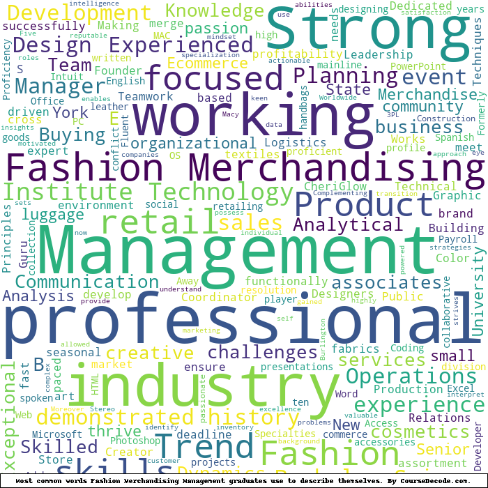 Here is a visual representation of the most common words seen in the "about" section of LinkedIn profiles who have a Bachelor degree in Fashion Merchandising Management (this is across all Fashion Merchandising Management graduates we've analyzed, not just those who went to Fashion Institute of Technology). This may or may not be useful:
