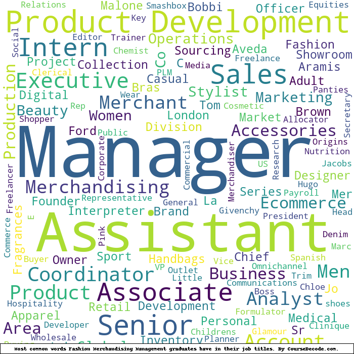 Here is a visual representation of the most common words in job titles for Fashion Merchandising Management graduates (this is across all Fashion Merchandising Management graduates we've analyzed, not just those who went to Fashion Institute of Technology):