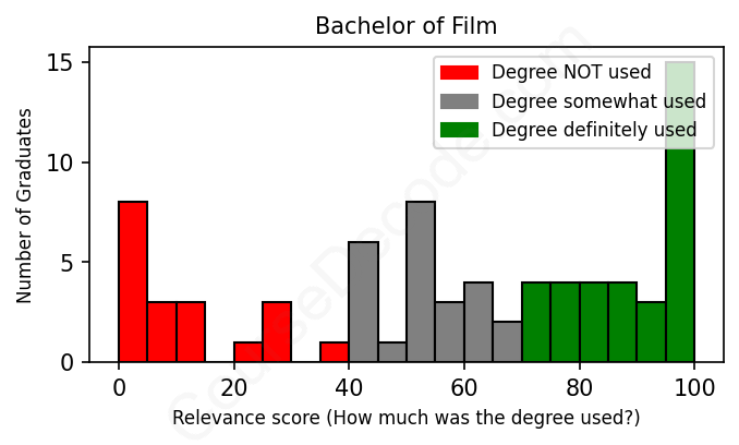 The verdict? Below average. Overall, with an average relevance score of 58%, Film graduates have a lower likelihood (-9%) of finding work in this field compared to the average graduate across all fields: