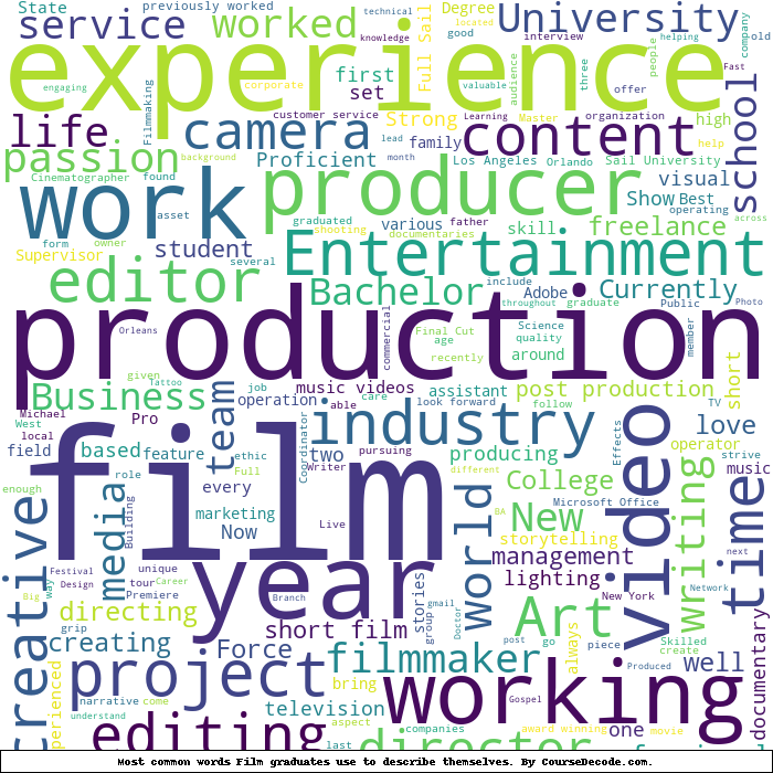 Here is a visual representation of the most common words seen in the "about" section of LinkedIn profiles who have a Bachelor degree in Film. This may or may not be useful: