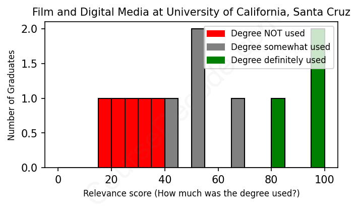 The verdict? Significantly below average. Overall, with an average relevance score of 51%, Film and Digital Media graduates from University of California, Santa Cruz have a much lower likelihood (-16%) of finding work in this field compared to the average graduate across all fields: