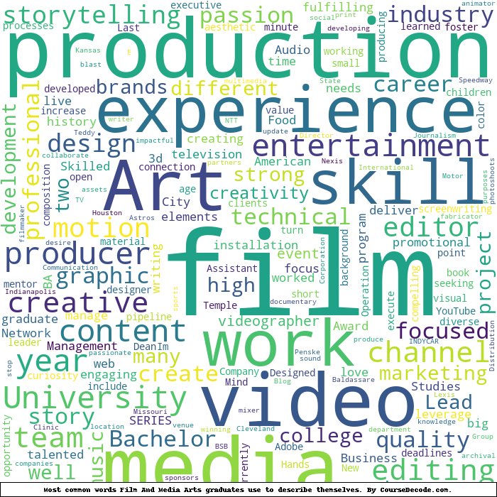 Here is a visual representation of the most common words seen in the "about" section of LinkedIn profiles who have a Bachelor degree in Film And Media Arts (this is across all Film And Media Arts graduates we've analyzed, not just those who went to Temple University). This may or may not be useful: