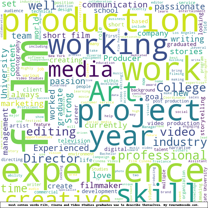 Here is a visual representation of the most common words seen in the "about" section of LinkedIn profiles who have a Bachelor degree in Film, Cinema and Video Studies. This may or may not be useful: