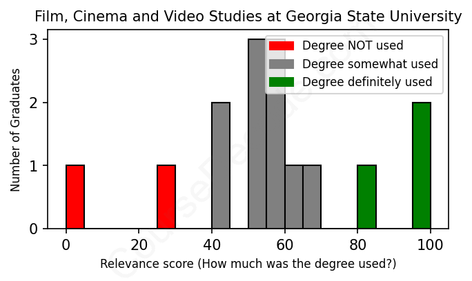 The verdict? Significantly below average. Overall, with an average relevance score of 56%, Film, Cinema and Video Studies graduates from Georgia State University have a much lower likelihood (-11%) of finding work in this field compared to the average graduate across all fields:
