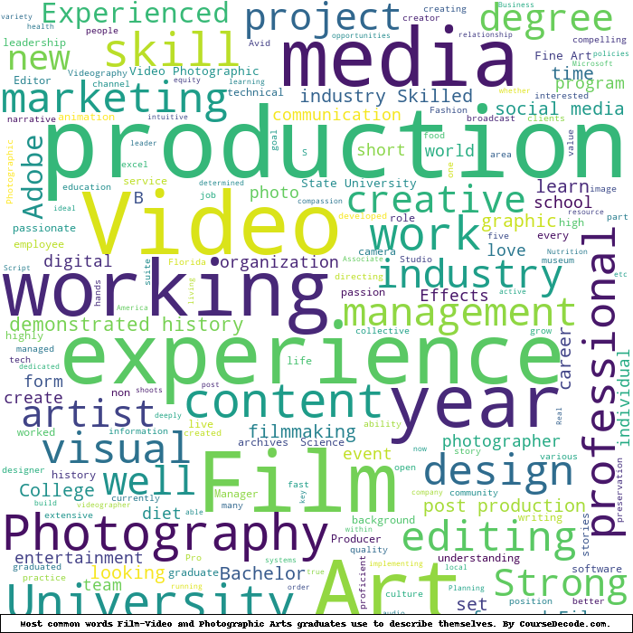 Here is a visual representation of the most common words seen in the "about" section of LinkedIn profiles who have a Bachelor degree in Film-Video and Photographic Arts. This may or may not be useful: