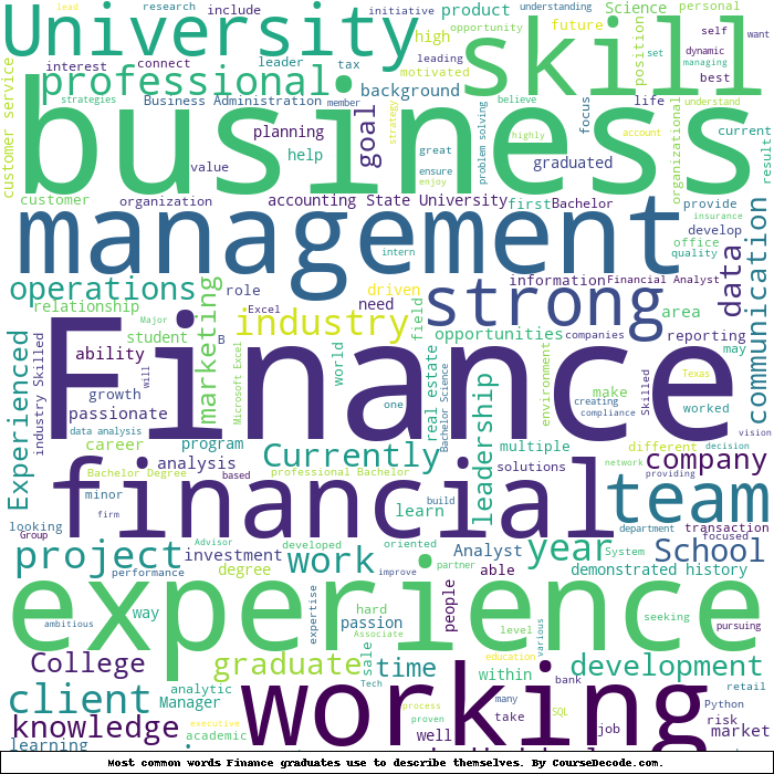 Here is a visual representation of the most common words seen in the "about" section of LinkedIn profiles who have a Bachelor degree in Finance. This may or may not be useful: