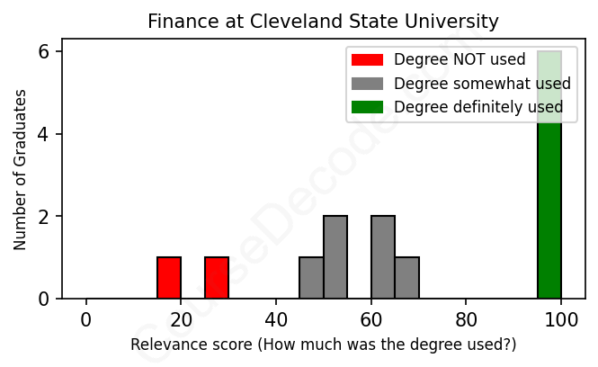 The verdict? Slightly above average. Overall, with an average relevance score of 70%, Finance graduates from Cleveland State University have a slightly higher likelihood (+3%) of finding work in this field compared to the average graduate across all fields: