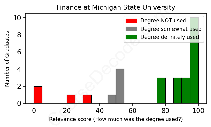 The verdict? Above average. Overall, with an average relevance score of 73%, Finance graduates from Michigan State University have a higher likelihood (+6%) of finding work in this field compared to the average graduate across all fields: