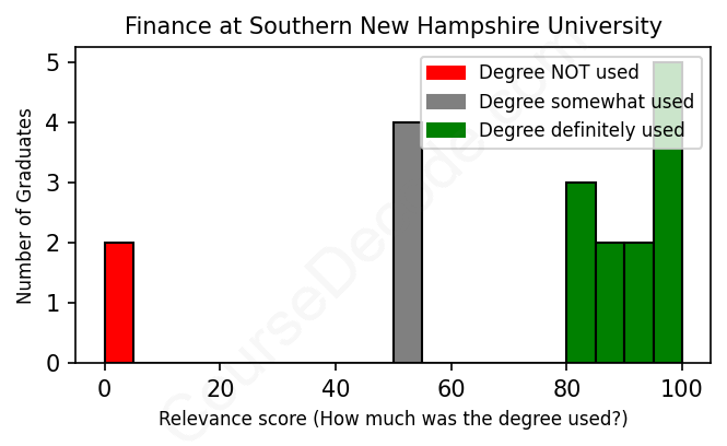 The verdict? Slightly above average. Overall, with an average relevance score of 72%, Finance graduates from Southern New Hampshire University have a slightly higher likelihood (+5%) of finding work in this field compared to the average graduate across all fields: