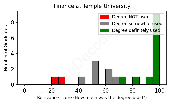 The verdict? Above average. Overall, with an average relevance score of 74%, Finance graduates from Temple University have a higher likelihood (+7%) of finding work in this field compared to the average graduate across all fields: