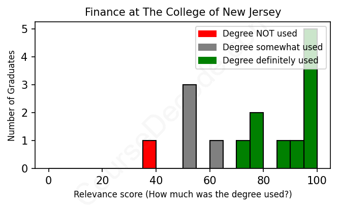 The verdict? Above average. Overall, with an average relevance score of 77%, Finance graduates from The College of New Jersey have a higher likelihood (+10%) of finding work in this field compared to the average graduate across all fields:
