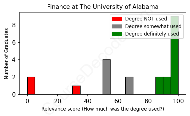 The verdict? Above average. Overall, with an average relevance score of 73%, Finance graduates from The University of Alabama have a higher likelihood (+6%) of finding work in this field compared to the average graduate across all fields: