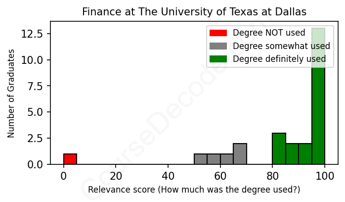 The verdict? Significantly above average. Overall, with an average relevance score of 84%, Finance graduates from The University of Texas at Dallas have a much higher likelihood (+17%) of finding work in this field compared to the average graduate across all fields: