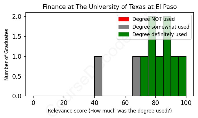 The verdict? Significantly above average. Overall, with an average relevance score of 78%, Finance graduates from The University of Texas at El Paso have a much higher likelihood (+11%) of finding work in this field compared to the average graduate across all fields: