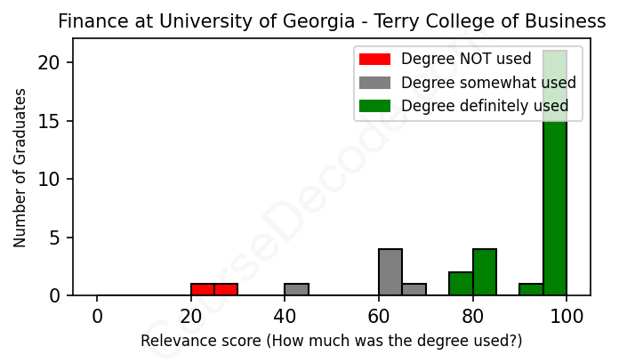 The verdict? Significantly above average. Overall, with an average relevance score of 85%, Finance graduates from University of Georgia - Terry College of Business have a much higher likelihood (+18%) of finding work in this field compared to the average graduate across all fields: