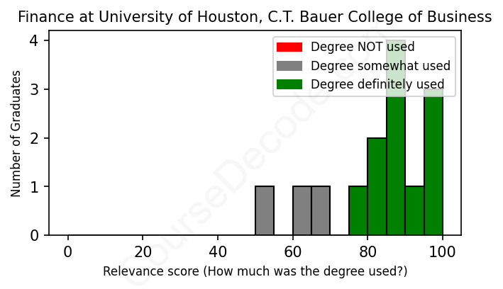 The verdict? Significantly above average. Overall, with an average relevance score of 82%, Finance graduates from University of Houston, C.T. Bauer College of Business have a much higher likelihood (+15%) of finding work in this field compared to the average graduate across all fields: