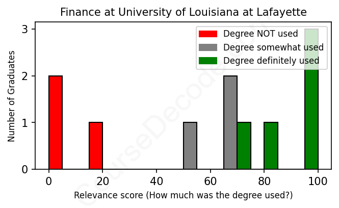 First, some facts. Of the Finance graduates from University of Louisiana at Lafayette we've analyzed , here's how many have used (or NOT used) their degree in their career: