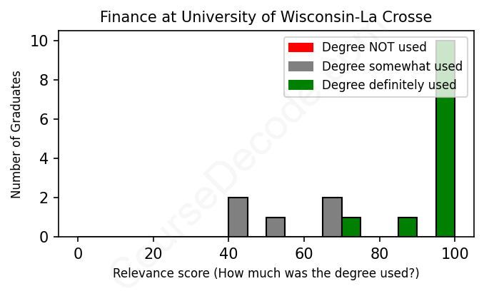 The verdict? Significantly above average. Overall, with an average relevance score of 83%, Finance graduates from University of Wisconsin-La Crosse have a much higher likelihood (+16%) of finding work in this field compared to the average graduate across all fields: