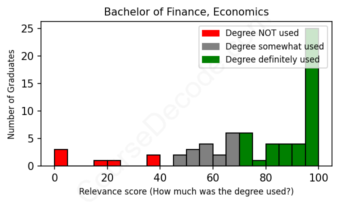 The verdict? Above average. Overall, with an average relevance score of 77%, Finance, Economics graduates have a higher likelihood (+10%) of finding work in this field compared to the average graduate across all fields: